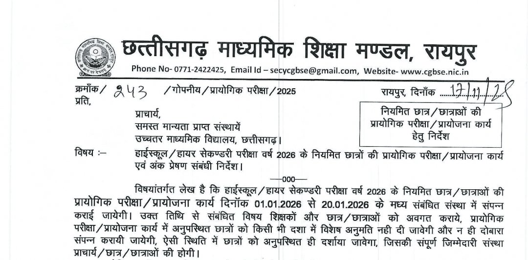 **रायपुर।** छत्तीसगढ़ माध्यमिक शिक्षा मंडल (माशिमं) ने हाई स्कूल और हायर सेकेंडरी परीक्षा 2026 के नियमित विद्यार्थियों के लिए प्रायोगिक परीक्षाओं का शेड्यूल जारी कर दिया है। आदेश अनुसार, सभी मान्यता प्राप्त शिक्षण संस्थानों में प्रैक्टिकल परीक्षाएँ **1 जनवरी से 20 जनवरी 2026** के बीच आयोजित की जाएंगी। इन परीक्षाओं में *आंतरिक एवं बाहरी दोनों परीक्षकों की उपस्थिति अनिवार्य* होगी।