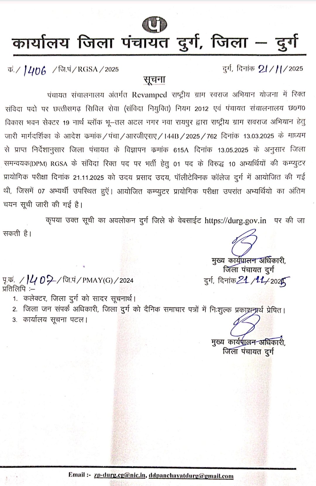 दुर्ग, 23 नवम्बर 2025। राष्ट्रीय ग्राम स्वराज अभियान के अंतर्गत जिला समन्वयक (आरजीएसए) के एक संविदा पद पर नियुक्ति के लिए तैयार की गई अंतिम चयन सूची जारी कर दी गई है। जिला पंचायत के मुख्य कार्यपालन अधिकारी बी. के. दुबे ने बताया कि अभ्यर्थी जारी सूची को दुर्ग जिले की आधिकारिक वेबसाइट पर जाकर देख सकते हैं। सूची ऑनलाइन अवलोकन के लिए उपलब्ध करा दी गई है।