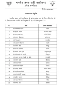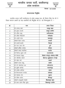 रायपुर, 03 दिसंबर। छत्तीसगढ़ भाजपा ने संगठन को मजबूत बनाने के उद्देश्य से व्यापक फेरबदल किया है। प्रदेशाध्यक्ष किरण सिंह देव ने राज्य के 36 जिलों में नए प्रभारियों की नियुक्ति की है, वहीं 17 प्रकोष्ठों में नए संयोजक और सहसंयोजक नियुक्त किए गए हैं। प्रदेश संगठन महामंत्री पवन साय द्वारा जारी आदेश के अनुसार कुल 41 नेताओं को नई जिम्मेदारियां सौंपी गई हैं।