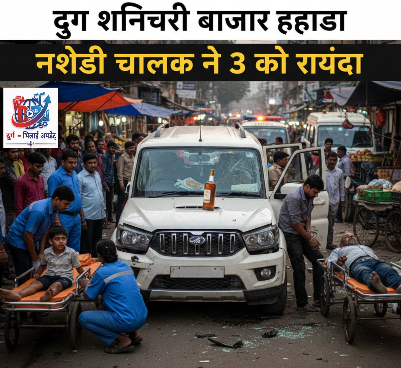 दुर्ग के व्यस्त शनिचरी बाजार में आज (12 दिसंबर) एक दर्दनाक सड़क दुर्घटना सामने आई है। एक नशेड़ी स्कॉर्पियो चालक ने लापरवाही की हद पार करते हुए राहगीरों को टक्कर मार दी, जिससे एक 9 वर्षीय बच्चे सहित तीन लोग गंभीर रूप से घायल हो गए। घायलों को तत्काल इलाज के लिए जिला अस्पताल में भर्ती कराया गया है।