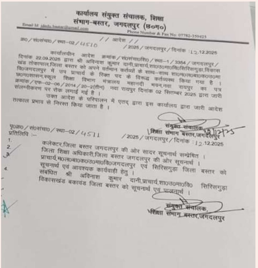 *जगदलपुर।* संलग्नीकरण की आड़ में शिक्षा विभाग से जुड़े विभिन्न कार्यालयों में जमे भ्रष्ट शिक्षकों की दाल अब नहीं गलने वाली है।संयुक्त संचालक शिक्षा ने संलग्नीकरण के ऐसे मामलों में कड़ा एक्शन लेना शुरू कर दिया है। संयुक्त संचालक की कार्रवाई की पहली गाज ओपन प्रभारी प्रचार्य अविनाश कुमार दानी पर गिरी है। संयुक्त संचालक ने दानी को उनके मूल पद पर वापस भेज दिया है।