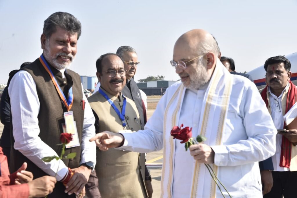 जगदलपुर, 13 दिसंबर 2025/ केंद्रीय गृहमंत्री श्री अमित शाह शनिवार को छत्तीसगढ़ के बस्तर संभाग मुख्यालय जगदलपुर स्थित माँ दंतेश्वरी एयरपोर्ट पहुँचे, जहाँ उनका आत्मीय स्वागत किया गया। गृहमंत्री के साथ प्रदेश के मुख्यमंत्री श्री विष्णु देव साय, विधानसभा अध्यक्ष डॉ. रमन सिंह और उप मुख्यमंत्री श्री विजय शर्मा का भी आत्मीय स्वागत किया गया।