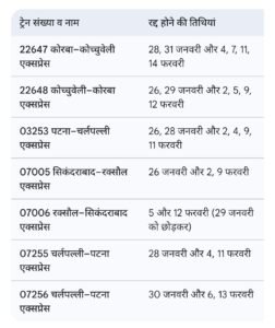 गाड़ी संख्या 12251 यशवंतपुर–कोरबा एक्सप्रेस 27 जनवरी और 3, 10, 13 फरवरी को अपने नियमित मार्ग के बजाय परिवर्तित मार्ग से चलेगी। यह ट्रेन अब काचीगुडा, निजामाबाद, मुदखेड़, पिंपल खुटी, नागपुर, दुर्ग और बिलासपुर होकर संचालित की जाएगी।