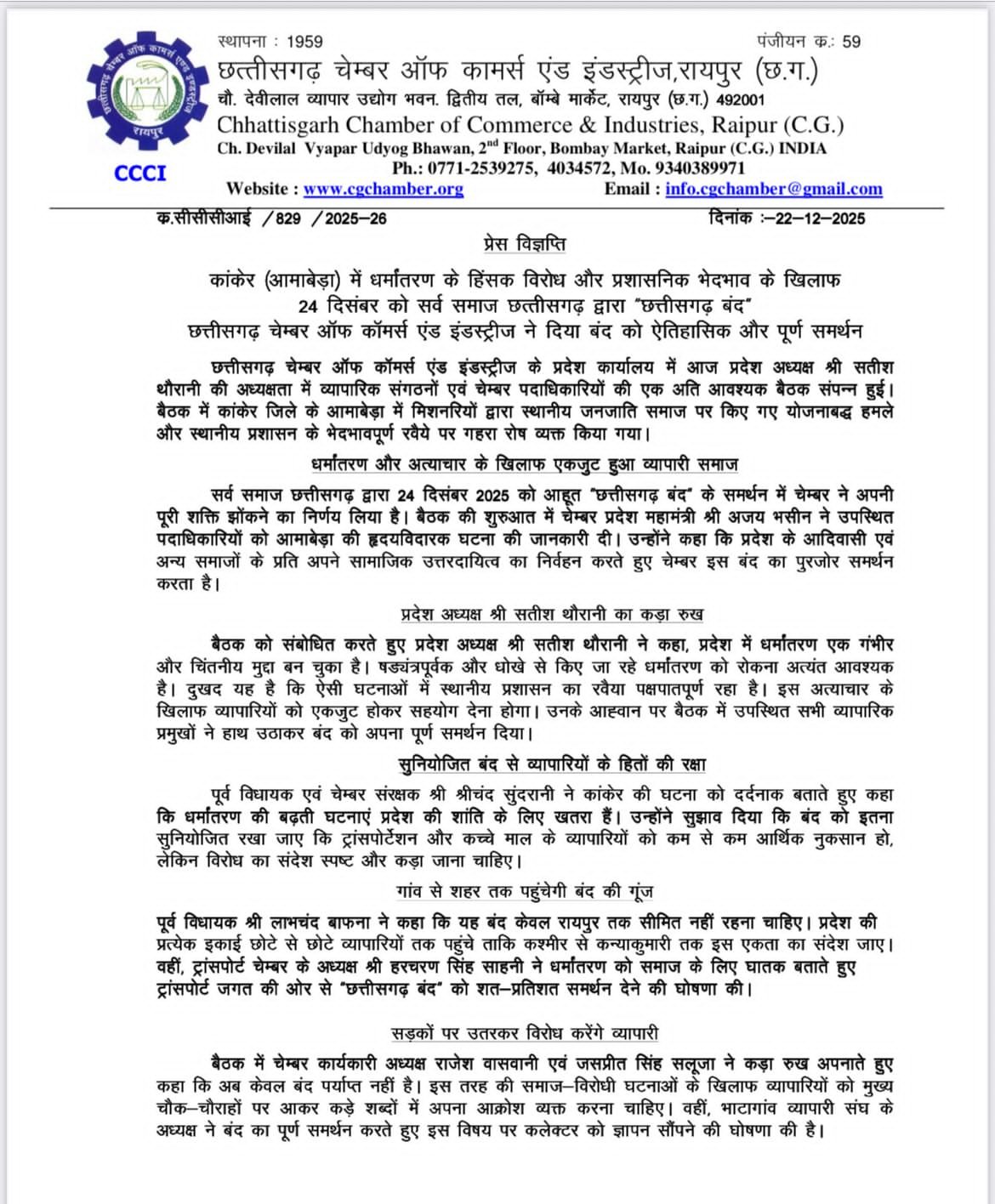 छत्तीसगढ़ चेंबर ऑफ कॉमर्स एंड इंडस्ट्रीज के प्रदेश कार्यालय में कल प्रदेश अध्यक्ष सतीश थौरानी की अध्यक्षता में व्यापारिक संगठनों एवं चेंबर पदाधिकारियों की अति आवश्यक बैठक हुई। बैठक में कांकेर जिले के आमाबेड़ा में मिशनरियों द्वारा स्थानीय जनजाति समाज पर किए गए योजनाबद्ध हमले और स्थानीय प्रशासन के भेदभावपूर्ण रवैये पर गहरा रोष व्यक्त किया गया। सर्व समाज छत्तीसगढ़ द्वारा 24 दिसंबर को आहूत छत्तीसगढ़ बंद के समर्थन में चेंबरने अपनी पूरी शक्ति झोंकने का निर्णय लिया है। बैठक की शुरुआत में चेम्बर प्रदेश महामंत्री अजय भसीन ने उपस्थित पदाधिकारियों को आमाबेड़ा की हृदय विदारक घटना की जानकारी दी। उन्होंने कहा कि प्रदेश के आदिवासी एवं अन्य समाजों के प्रति अपने सामाजिक उत्तरदायित्व का निर्वहन करते हुए चेम्बर इस बंद का पुरजोर समर्थन करता है। बैठक को संबोधित करते हुए प्रदेश अध्यक्ष सतीश थौरानी ने कहा कि प्रदेश में धर्मांतरण एक गंभीर और चिंतनीय मुद्दा बन चुका है। षड्यंत्रपूर्वक और धोखे से किए जा रहे धर्मांतरण को रोकना अत्यंत आवश्यक है। दुखद यह है कि ऐसी घटनाओं में स्थानीय प्रशासन का रवैया पक्षपातपूर्ण रहा है। इस अत्याचार के खिलाफ व्यापारियों को एकजुट होकर सहयोग देना होगा। उनके आह्वान पर बैठक में उपस्थित सभी व्यापारिक प्रमुखों ने हाथ उठाकर बंद को अपना पूर्ण समर्थन दिया। पूर्व विधायक एवं चेम्बर संरक्षक श्रीचंद सुंदरानी ने कांकेर की घटना को दर्दनाक बताते हुए कहा कि धर्मांतरण की बढ़ती घटनाएं प्रदेश की शांति के लिए खतरा हैं। उन्होंने सुझाव दिया कि बंद को इतना सुनियोजित रखा जाए कि ट्रांसपोर्टेशन और कच्चे माल के व्यापारियों को कम से कम आर्थिक नुकसान हो, लेकिन विरोध का संदेश स्पष्ट और कड़ा जाना चाहिए।