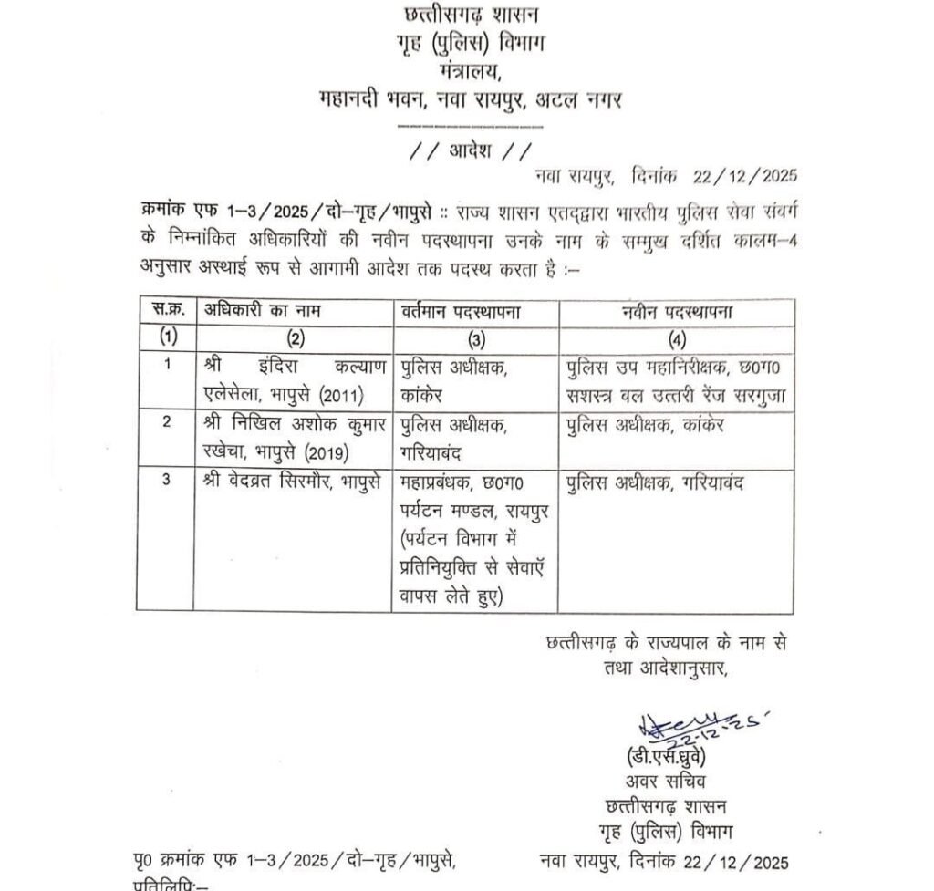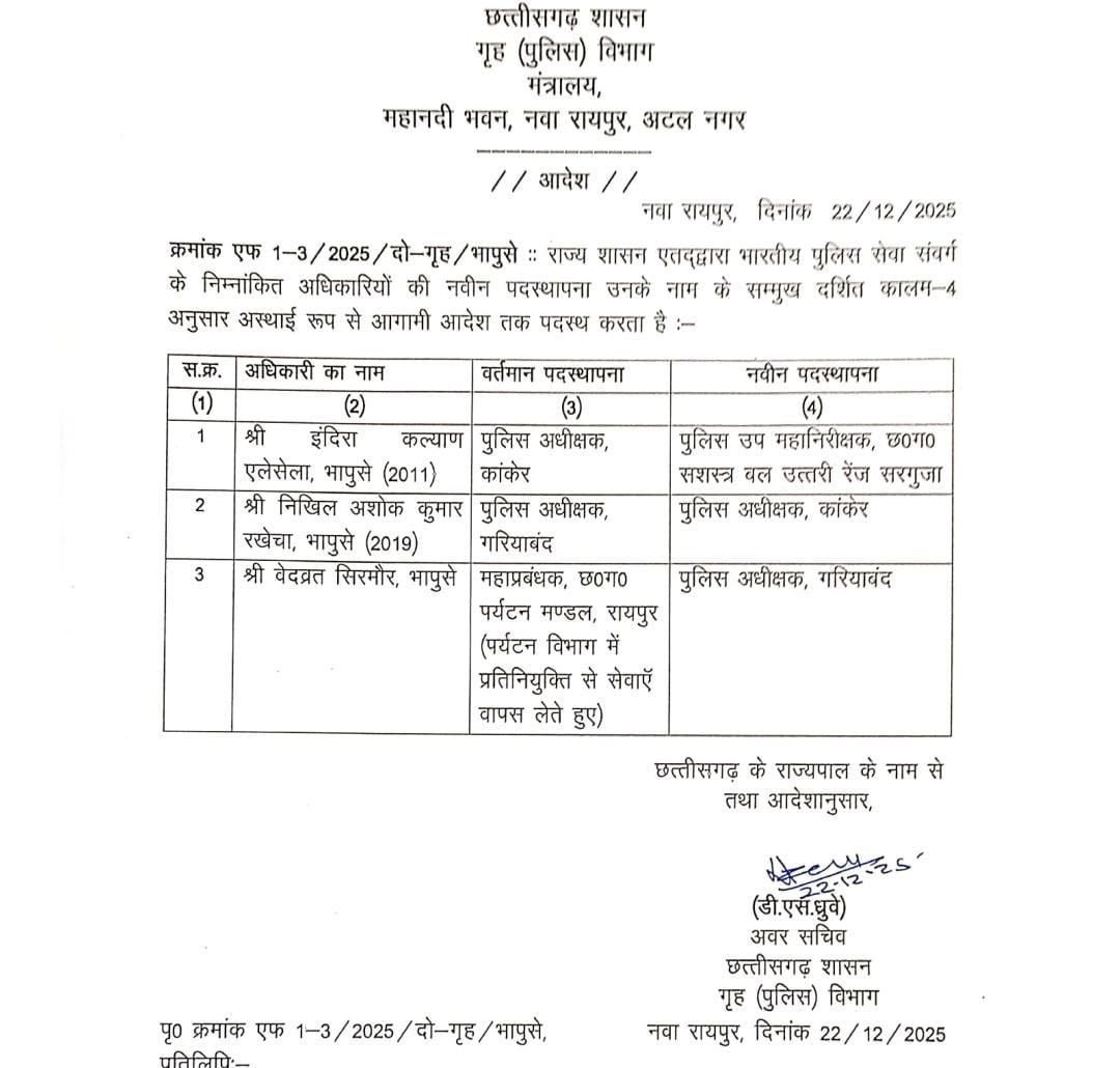 *कांकेर।* जिले के पुलिस अधीक्षक इंदिरा कल्याण एलेसेला का तबादला कर दिया गया है। उनकी जगह गरियाबंद के एसपी निखिल अशोक कुमार राखेचा को कांकेर का एसपी नियुक्त किया गया है। श्री राखेचा तेज तर्रार एवं अनुशासन के पक्के युवा आईपीएस अफसर माने जाते हैं। पहले वे प्रोबशनल अवधि में भिलाई में बतौर सीएसपी सेवा दे चुके हैं। कानून व्यवस्था को सुदृढ़ बनाए रखने में वे हमेशा सजग रहते हैं। नक्सल प्रभावित गरियाबंद जिले में एसपी निखिल अशोक कुमार राखेचा के नेतृत्व में फोर्स ने एंटी नक्सल ऑपरेशंस में कई बड़ी कामयाबियां हासिल की हैं। एसपी इंदिरा कल्याण एलेसेला के तबादले को कांकेर जिले के आमाबेड़ा में हालिया हुई घटना से जोड़कर देखा जा रहा है।