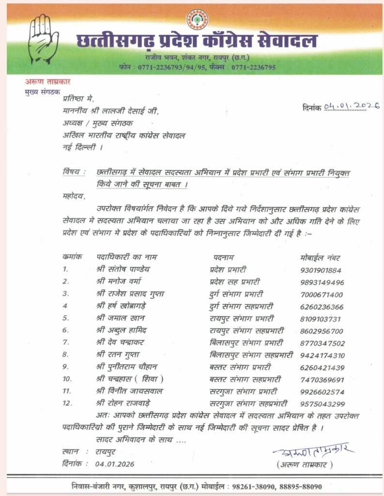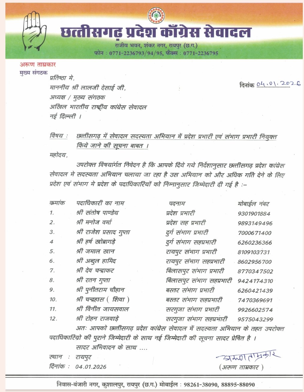 छत्तीसगढ़ प्रदेश कांग्रेस सेवादल के मुख्य संगठक अरुण ताम्रकार ने इस बाबत आधिकारिक पत्र जारी कर नई नियुक्तियों की जानकारी दी है। उन्होंने बताया कि संगठन का मुख्य उद्देश्य सदस्यता अभियान को निचले स्तर तक पहुंचाना और अधिक से अधिक लोगों को सेवादल की विचारधारा से जोड़ना है। इसी रणनीति के तहत पुराने अनुभवी नेताओं के साथ-साथ नए चेहरों को भी जिम्मेदारी दी गई है ताकि अभियान को सुचारू रूप से चलाया जा सके। जारी सूची के अनुसार, सदस्यता अभियान के लिए पूरे प्रदेश की निगरानी और संचालन की जिम्मेदारी वरिष्ठ नेता संतोष पांडेय को दी गई है, जिन्हें प्रदेश प्रभारी नियुक्त किया गया है। वहीं उनके सहयोग के लिए मनोज वर्मा को प्रदेश सह प्रभारी बनाया गया है। ये दोनों पदाधिकारी राज्य स्तर पर अभियान की समीक्षा करेंगे। प्रदेश के सभी प्रमुख संभागों में अभियान को प्रभावी बनाने के लिए अलग-अलग प्रभारी और सह प्रभारी नियुक्त किए गए हैं। दुर्ग संभाग प्रभारी राजेश प्रसाद गुप्ता और सह प्रभारी हर्ष खोब्रगढ़े, रायपुर संभाग और आसपास के क्षेत्रों के लिए प्रभारी जमाल खान और सह प्रभारी अब्दुल हामिद बनाए गए हैं। बिलासपुर संभाग प्रभारी देव चंद्राकर और सह प्रभारी रतन गुप्ता केसरवानी नियुक्त किए गए हैं। आदिवासी बाहुल्य बस्तर संभाग में संगठन को मजबूत करने के लिए पुनीताराम चौहान को प्रभारी और चंद्रहास शिवा को सह प्रभारी नियुक्त किया गया है। सरगुजा संभाग प्रभारी विनीत जायसवाल और सह प्रभारी रोहन राजवाड़े को बनाया गया है। प्रदेश मुख्य संगठक अरुण ताम्रकार ने बताया कि इन नियुक्तियों की सूचना अखिल भारतीय राष्ट्रीय कांग्रेस सेवादल को प्रेषित कर दी गई है। उन्होंने नवनियुक्त पदाधिकारियों से अपेक्षा की है कि वे अपनी पुरानी जिम्मेदारियों के साथ-साथ इस नई जिम्मेदारी का भी निर्वहन पूरी निष्ठा से करेंगे और प्रदेश में कांग्रेस सेवादल के सदस्यता अभियान को ऐतिहासिक सफलता दिलाएंगे।