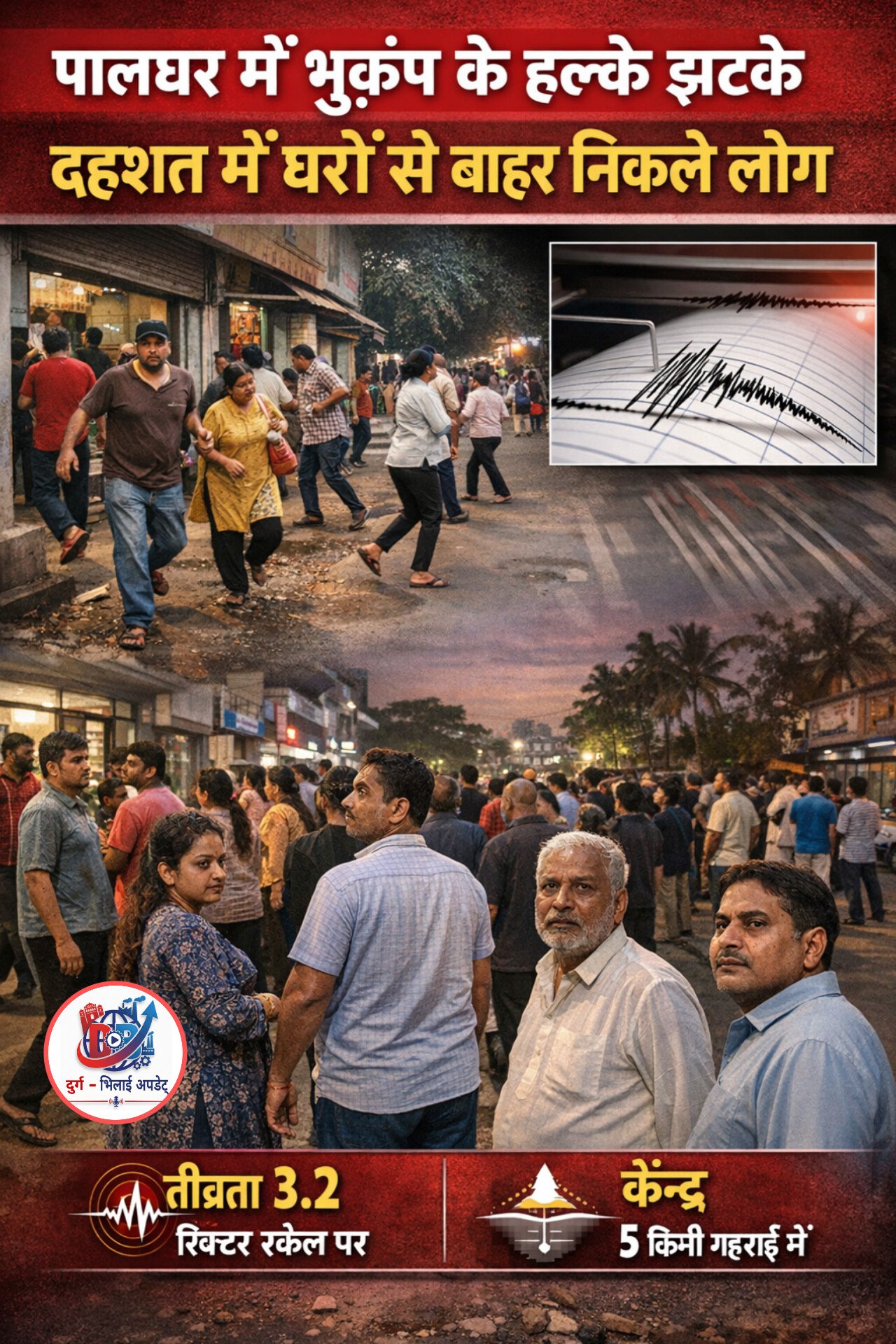 पालघर, 11 जनवरी (दुर्ग भिलाई अपडेट)। महाराष्ट्र के पालघर जिले में रविवार शाम भूकंप के हल्के झटके महसूस किए गए, जिससे लोगों में कुछ देर के लिए अफरा-तफरी मच गई। नेशनल सेंटर फॉर सीस्मोलॉजी के अनुसार भूकंप की तीव्रता रिक्टर स्केल पर 3.2 मापी गई। भूकंप का केंद्र धरती की सतह से करीब 5 किलोमीटर नीचे बताया गया है।