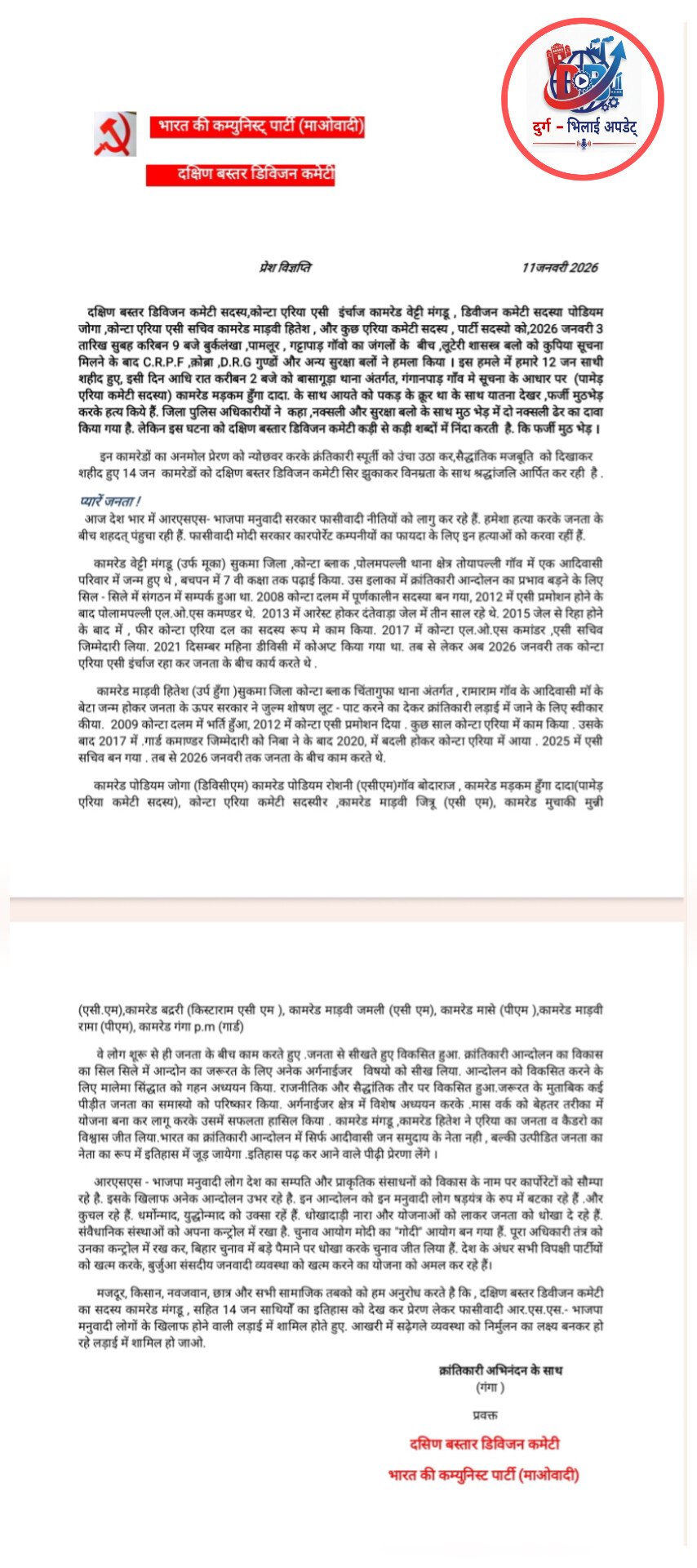 दक्षिण बस्तर डिवीजन कमेटी के प्रवक्ता गंगा द्वारा जारी इस पत्र में सदस्य, कमेटी सदस्य एवं कोंटा एरिया एसी इंचार्ज वेठी मांगू, डिवीजन कमेटी सदस्य पोडियम जोगा, कोंटा एरिया एसी सचिव माईडी हिसरा, और कुछ एरिया कमेटी सदस्यों पर 3 जनवरी को 9 बजे कुरवेलार, ग्रामेर, गुदापाड़ा गांवों के जंगलों में पुलिस, सीआरपीएफ, कोबरा, डीआरजी और अन्य सुरक्षा बलों ने हमला किया। इस हमले में 12 जन साथी शहीद हुए, इसी दिन रात 2 बजे को बारसूर थाना अंतर्गत, गंगालगुड़ा गांव में प्रभारी एरिया कमेटी सदस्य) कामरेड मदकम हिड़मा उर्फ बावा, और कमेटी के एक अन्य कार्यकर्ता को पुलिस बल ने घेर कर हमला करते हुए ढेर किया। जिला पुलिस अधिकारियों ने कहा, नक्सलियों और सुरक्षा बलों के बीच मुठभेड़ हुई और नक्सली ढेर हो गए। लेकिन इस दावे का दक्षिण बस्तर डिवीजन कमेटी खंडन करती है। कोई भी मुठभेड़ नहीं हुई है। आम जनता को संबोधित करते हुए गंगा ने कहा है कि आज हमारे भारत में आरएसएस, भाजपा मनुवादी सरकार जनविरोधी कानून को लागू कर रही है। आज तक जनता आंदोलन चलाकर सरकारों को सत्ता से बाहर करती रही है। आरएसएस, भाजपा मनुवादी देश के समृद्ध और प्राकृतिक संसाधन को विकास के नाम पर कंपनियों को सौंपा रहे हैं। इसके खिलाफ जन आंदोलन उभर रहा है। हम क्रांतिकारी के रूप में लड़ रहे हैं और कुर्बान दे रहे हैं। सरकार जनता को गुमराह कर रही है। हम मनुवादी व्यवस्था को खत्म करने की योजना पर काम कर रहे हैं। हम क्रांतिकारी आंदोलन कर रहे हैं। जब तक गरीब शोषित और शोषक वर्ग है तब तक हम आंदोलन जारी रखेंगे। जनता का मनुवादी व्यवस्था का विरोध करे और क्रांतिकारी मानववादी समाज का समर्थन न करने के लिए आगे आए।