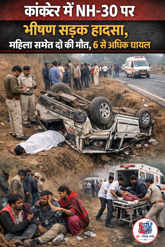 कांकेर, 14 जनवरी (दुर्ग भिलाई अपडेट)। जिले में नेशनल हाइवे-30 पर बुधवार को एक दर्दनाक सड़क दुर्घटना हो गई। तेज रफ्तार में जा रहा एक क्रूजर वाहन चालक के नियंत्रण से बाहर होकर सड़क किनारे गहरे गड्ढे में पलट गया। इस भीषण हादसे में एक महिला सहित दो लोगों की मौके पर ही मौत हो गई।