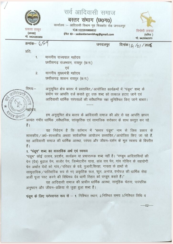 *जगदलपुर।* सर्व आदिवासी समाज ने अनुसूचित क्षेत्र बस्तर में प्रस्तावित एवं आयोजित कार्यक्रमों में “पंडूम” शब्द के प्रयोग पर आपत्ति दर्ज कराते हुए उक्त शब्द को तत्काल हटाने एवं आदिवासी धार्मिक परंपराओं की संवैधानिक रक्षा सुनिश्चित करने की मांग की है। सर्व आदिवासी समाज के बस्तर संभाग अध्यक्ष प्रकाश ठाकुर ने इस संबंध में राजयपाल, मुख्यमंत्री, आदिम जाति कल्याण मंत्री एवं शीर्ष अधिकारियों को पत्र प्रेषित किया है।