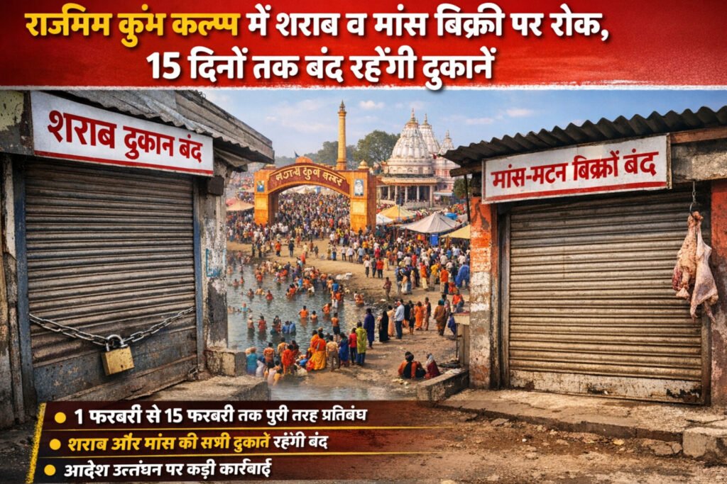 राजिम कुंभ कल्प मेला 2026 को लेकर प्रशासन ने धार्मिक मर्यादा और श्रद्धालुओं की आस्था को ध्यान में रखते हुए बड़ा निर्णय लिया है। राज्य शासन एवं कलेक्टर गरियाबंद द्वारा जारी आदेश के अनुसार कुंभ अवधि के दौरान राजिम क्षेत्र में शराब और मांस-मटन की बिक्री पूरी तरह प्रतिबंधित रहेगी।