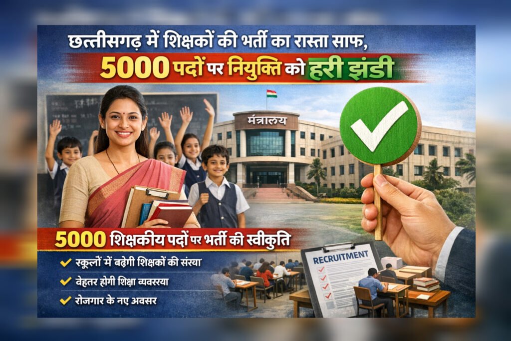 छत्तीसगढ़ सरकार ने स्कूल शिक्षा व्यवस्था को मजबूत करने के उद्देश्य से बड़ा फैसला लिया है। राज्य के स्कूल शिक्षा विभाग को 5000 शिक्षकीय पदों पर नई भर्ती की स्वीकृति मिल गई है। इस निर्णय से प्रदेश के शासकीय विद्यालयों में शिक्षकों की कमी दूर होने की उम्मीद है।