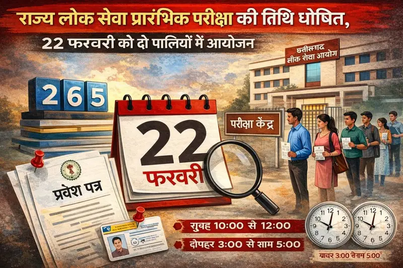 रायपुर, 12 फरवरी (दुर्ग भिलाई अपडेट)। छत्तीसगढ़ लोक सेवा आयोग ने राज्य सेवा प्रारंभिक परीक्षा की तिथि घोषित कर दी है। यह परीक्षा 22 फरवरी 2026 को प्रदेश के सभी 33 जिलों में बनाए गए निर्धारित केंद्रों पर संपन्न कराई जाएगी। अभ्यर्थी अपने प्रवेश पत्र आयोग के आधिकारिक जालस्थल से प्राप्त कर सकते हैं।