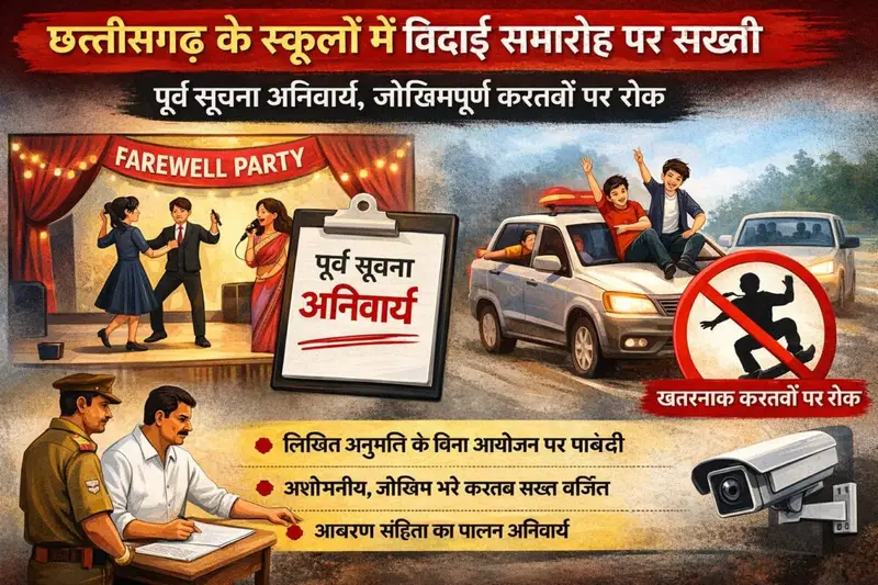 आयोग ने कहा है कि स्कूल प्रबंधन को हर सांस्कृतिक आयोजन या समारोह से पहले विधिवत जानकारी देना आवश्यक होगा। साथ ही कार्यक्रमों के संचालन के लिए निश्चित आचरण संहिता तैयार करने के निर्देश दिए गए हैं, ताकि आयोजन अनुशासित, मर्यादित और सुरक्षित वातावरण में संपन्न हो सकें। स्कूल की गरिमा बनाए रखने पर विशेष बल दिया गया है। किसी भी प्रकार के खतरनाक प्रदर्शन, अनुचित गतिविधि या अवांछित व्यवहार पर सख्त प्रतिबंध रहेगा। यह निर्णय हाल के कुछ चिंताजनक घटनाक्रमों के बाद लिया गया है। धमतरी जिले में पाँच फरवरी को विदाई समारोह के दौरान छात्रों द्वारा जोखिम भरा करतब करने के प्रयास में एक कार अनियंत्रित होकर पेड़ से टकरा गई थी, जिसमें पाँच विद्यार्थी गंभीर रूप से घायल हो गए। इसके बाद जिला शिक्षा अधिकारी ने शासकीय स्कूलों में ऐसे खतरनाक कृत्यों पर रोक लगाने का आदेश जारी किया।