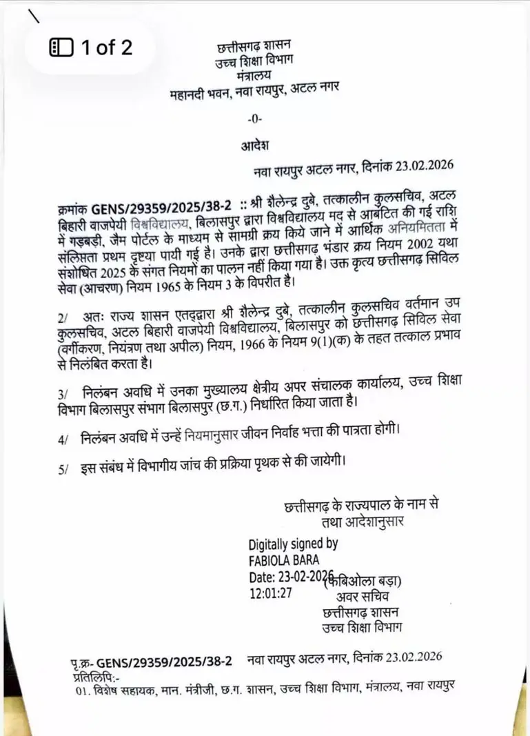 छत्तीसगढ़ के बिलासपुर स्थित अटल बिहारी वाजपेयी विश्वविद्यालय में वित्तीय अनियमितताओं के मामले में उच्च शिक्षा विभाग ने बड़ी प्रशासनिक कार्रवाई करते हुए तत्कालीन कुलसचिव एवं वर्तमान उप कुलसचिव शैलेंद्र दुबे को निलंबित कर दिया है। इस संबंध में मंत्रालय द्वारा आधिकारिक आदेश जारी कर दिया गया है।