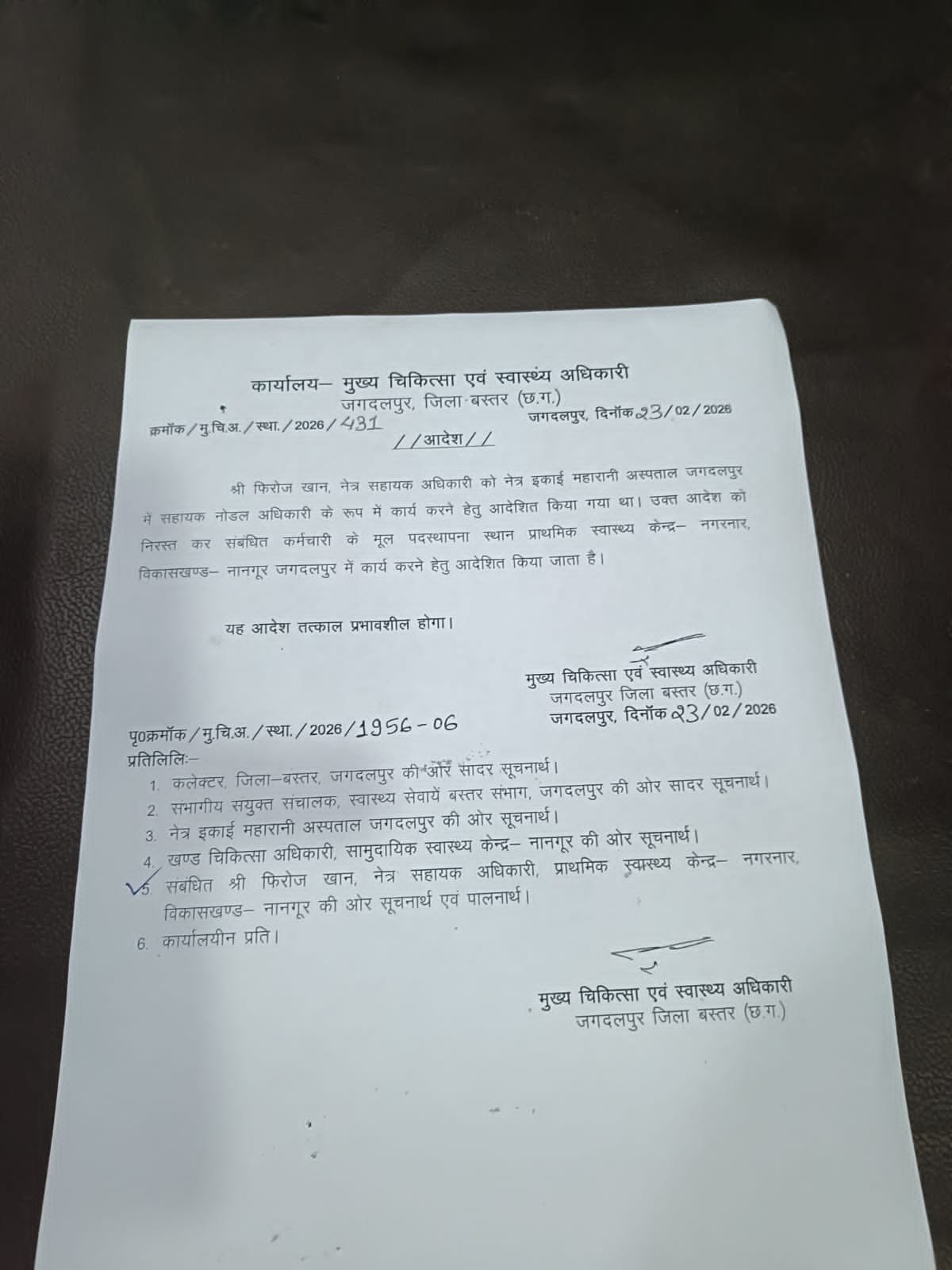 *जगदलपुर।* महारानी जिला चिकित्सालय जगदलपुर में बवाल मचाने और महिला कर्मियों से गाली गलौज करने वाले नेत्र सहायक अधिकारी पर अंततः कार्रवाई कर दी गई है। बस्तर. के मुख्य जिला चिकित्सा एवं स्वास्थ्य अधिकारी ने उन्हें उनके मूल पदास्थपना वाले प्राथमिक स्वास्थ्य केंद्र के लिए वापस रवाना कर दिया है।
